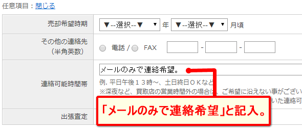任意項目の欄で「メールのみで連絡希望」と入力すると、電話がかかってくる確率が低くなります。